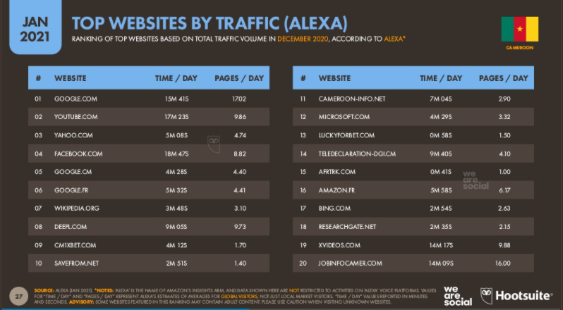 Sites web les plus visités au Cameroun (2021) par Alexa