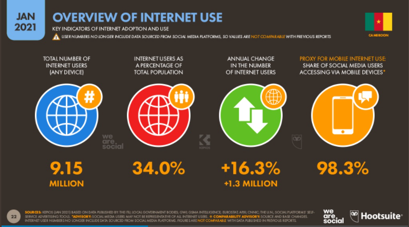 Sur une population de près de 28 millions d’habitants, le Cameroun a un taux de pénétration d’Internet de 34%, plus 4% en un an. Ce qui représente 9,15 millions d’internautes camerounais. C’est une évolution de 7,8%, soit 1,3 million nouveaux internautes depuis 2020.