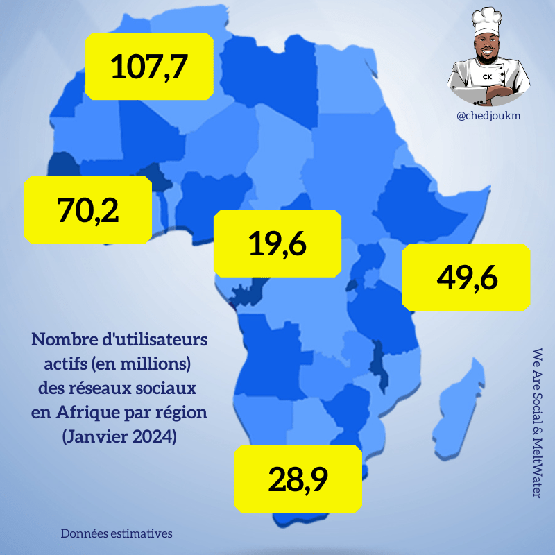 En 2024, l’Afrique comptabilise 276,2 millions d’utilisateurs sur les réseaux sociaux, témoignant de l’impact grandissant de ces plateformes dans le quotidien des Africains. L’Afrique du Nord se place en tête avec 107,7 millions d’utilisateurs, suivie de près par l’Afrique de l’Ouest qui enregistre 70,23 millions d’utilisateurs. Ces chiffres reflètent une intégration digitale profonde et une soif de connectivité sociale à travers le continent.