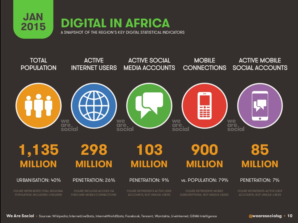 Le mobile maintenant. Et ben là, on compte près de 900 millions d’abonnés à un opérateur de téléphonie mobile en Afrique. Ce qui représente un taux de pénétration de 79% en Afrique. Il faut noter également que parmi ces abonnés, 85 millions sont des utilisateurs actifs des réseaux sociaux sur mobile (taux de pénétration de 7%)