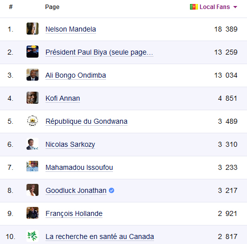 En ce qui concerne les fans camerounais, voici le top 10 des pages les plus likés au Cameroun :