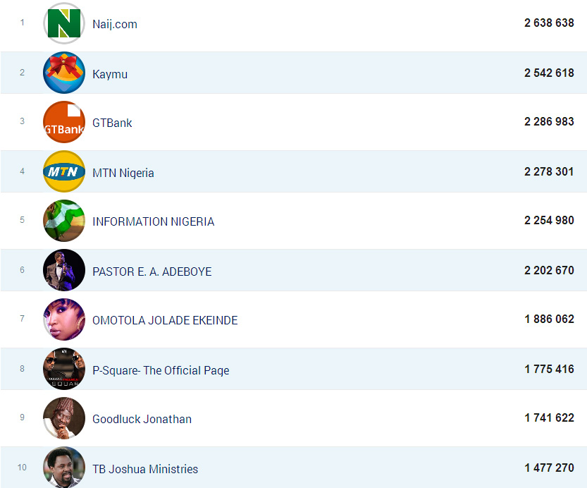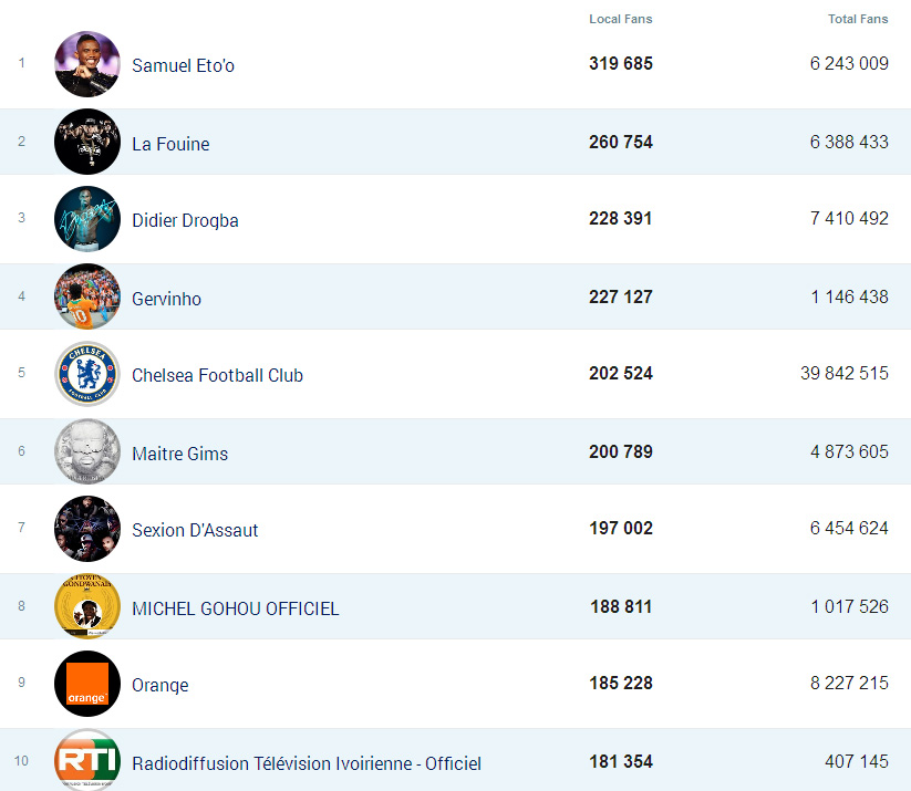Ensuite, le top 10 des personnalités les plus aimées par les Camerounais sur Facebook :
